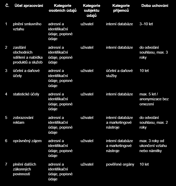 Správce je oprávněn zpracovávat následující osobní údaje dle účelu, dle kategorií osobních údajů, dle kategorií subjektu údajů, dle kategorií příjemců a dle doby uchování následovně.